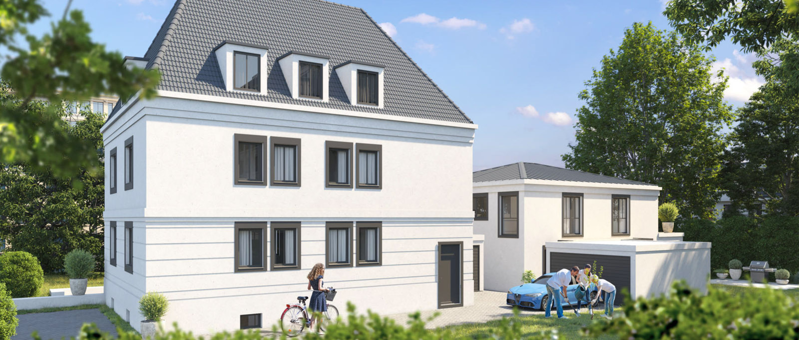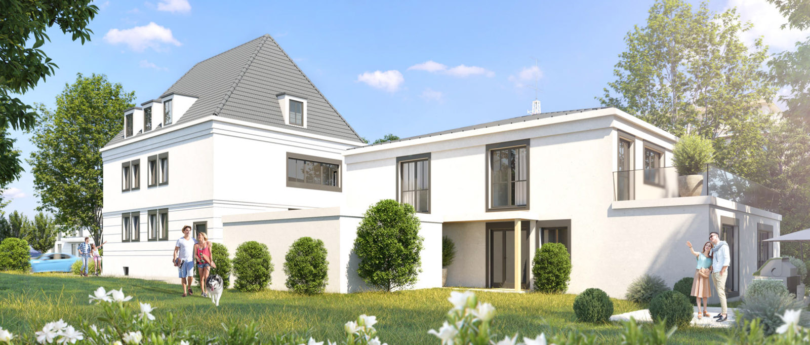 Das Projekt New-Classic besteht aus 4 Wohneinheiten im kernsanierten Bestandsgebäude und 2 Neubau-Doppelhaushälften mit 3 Garagen, 1 Carport und 4 Unterflur-Parkern. Geplante Fertigstellung der Anlage ist Q1-2026.